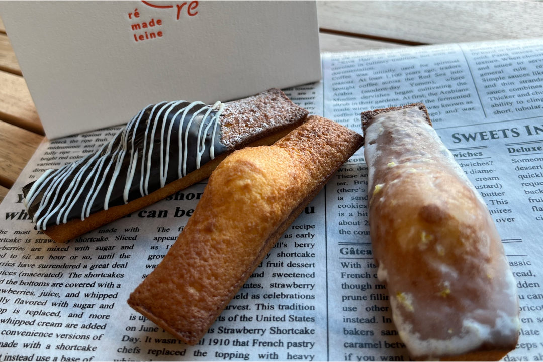 お店で⽣地を作り、お店で焼き上げ、焼きたてのマドレーヌをお届け。ぜひ、⼿にとって、ご賞味ください。