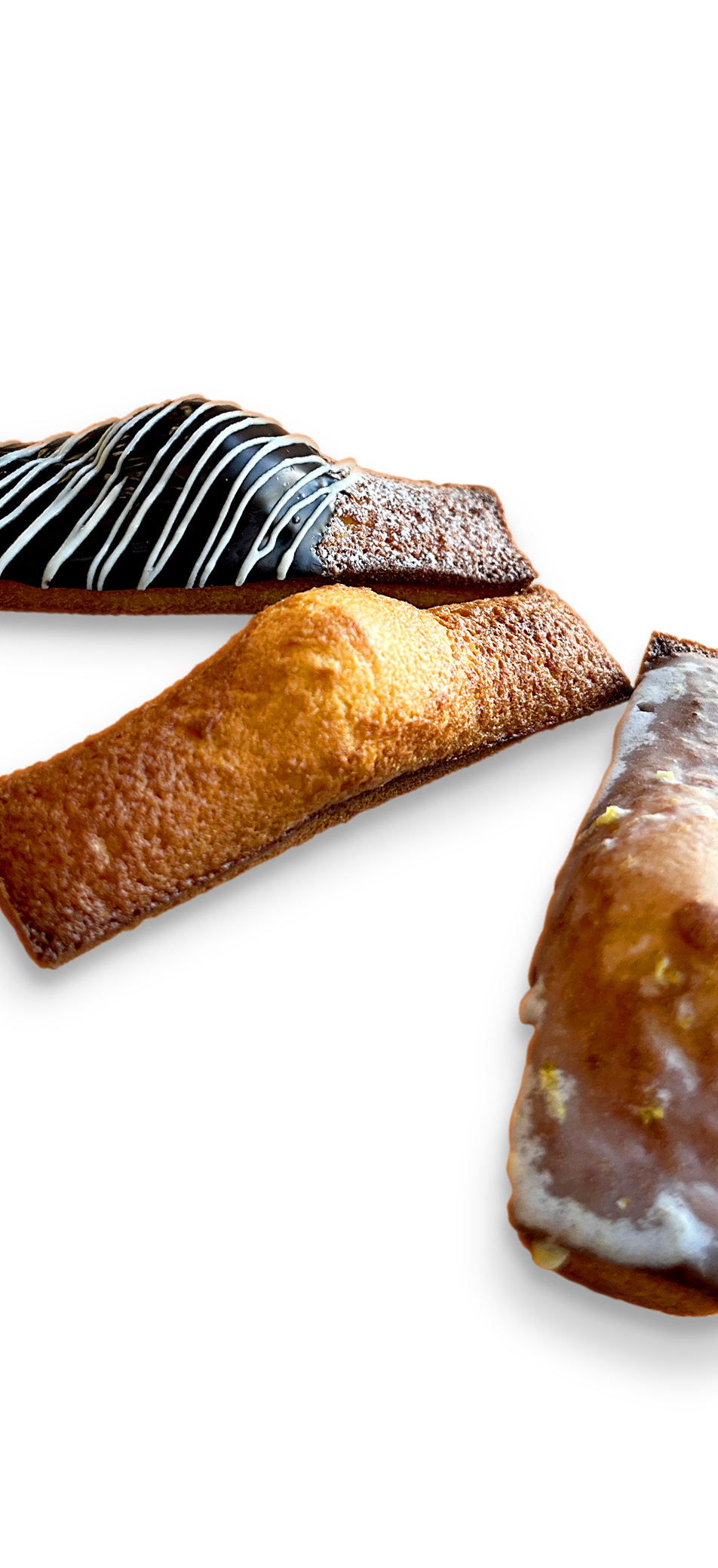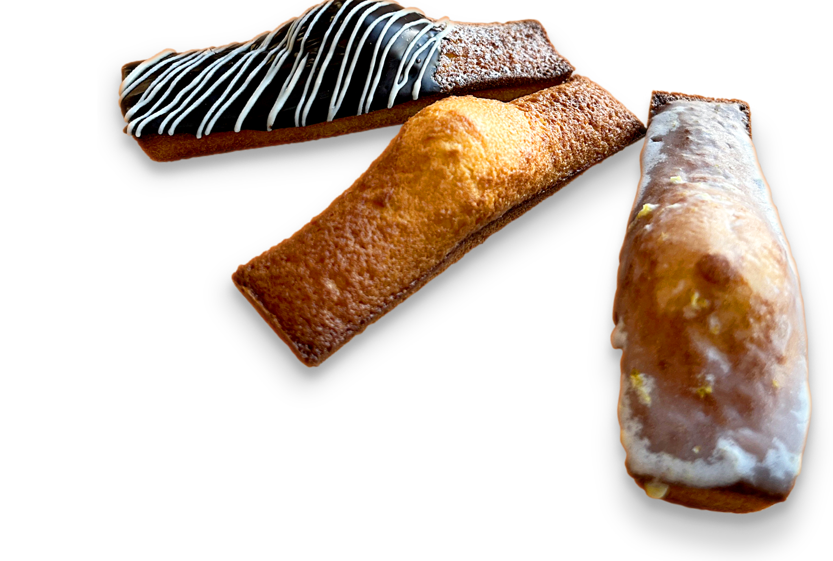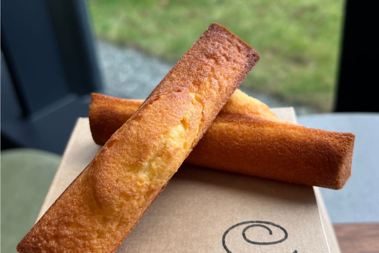 カリっとした表⾯の⾷感をたくさん味わっていただくため、また気軽に⼿にとって⾷べやすくするために商品の形状をマドレーヌらしさとは離れた“棒状” の型で焼き上げました。