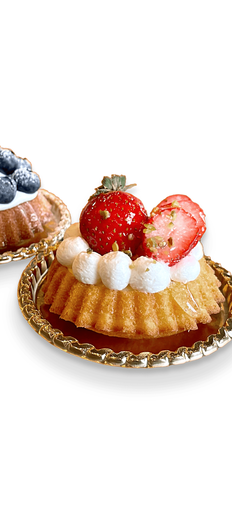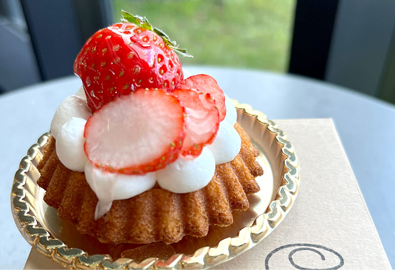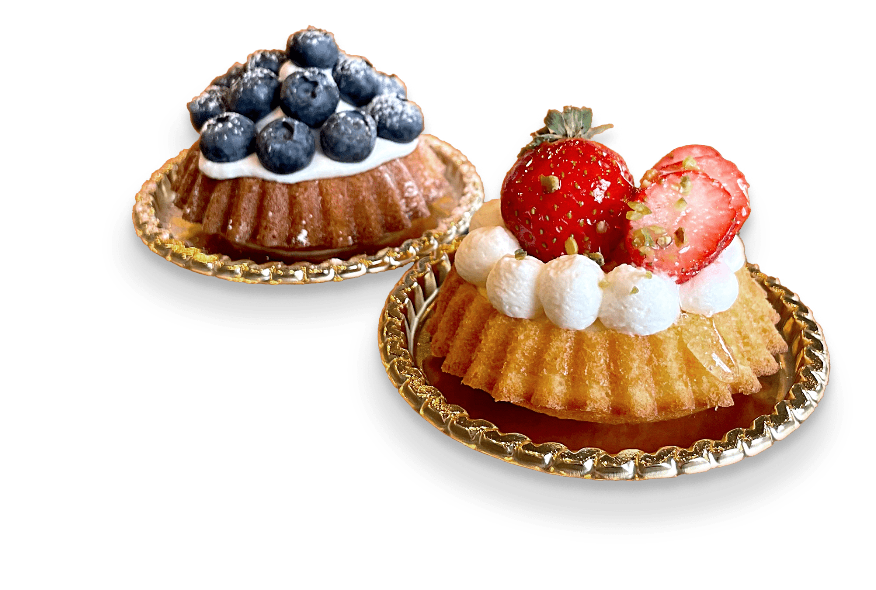 道産発酵バターの濃厚な香りと味わいを感じる、しっとりとした食感としっかりとした濃厚なマドレーヌをベースに、季節のフルーツをトッピングしたマドレーヌで作ったケーキです。